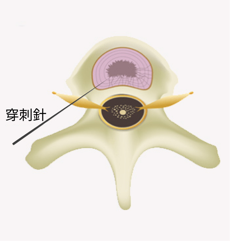 局所麻酔下で、X線透視装置を使用しながら、0.8㎜の針(穿刺針)を椎間板に留置し、椎間板に治療薬を注入します。特に脱出したヘルニアにも、ゲルが浸透する程効果が高くなります。 身体の負担の少ない局所麻酔にて、細い針のみを使用して治療を行うため傷跡も目立たず、1時間ほど安静にして頂くだけで治療後すぐにご帰宅頂けます。