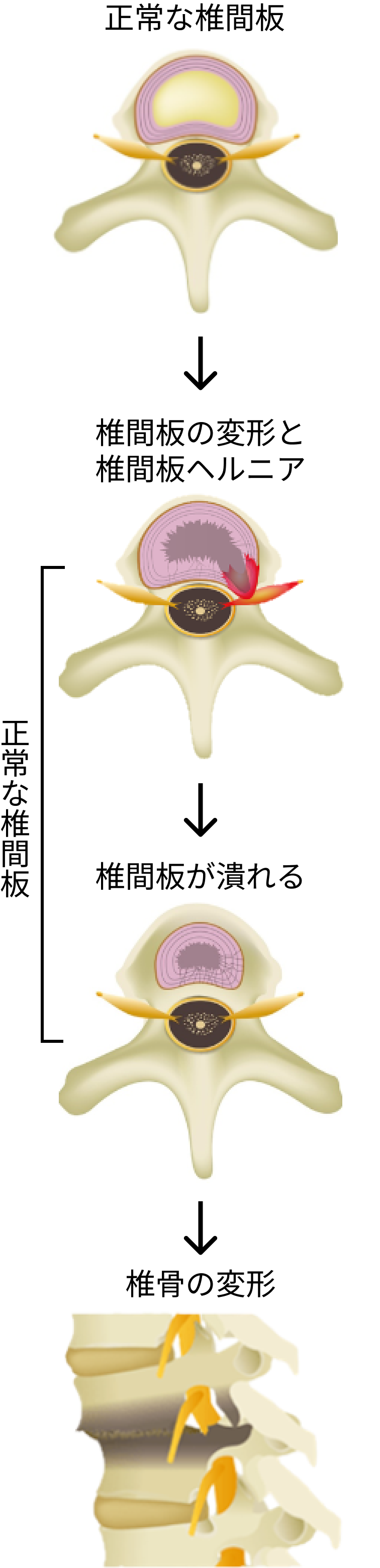 椎間板変性症が進めば進むほど、椎間板内の水分がなくなっていき、椎間板が薄くなり潰れた状態になります。